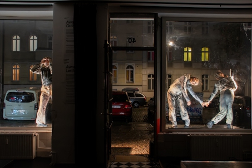The sidelight made the performers’ eyeballs shimmer, their irises iridescent and translucent. Some pointed their index at the window and seemed to reach for the inside, others detached from the shop window altogether, to copy another performer’s movement further away, on the pavement, stretching our depth of vision back onto the pavement.
