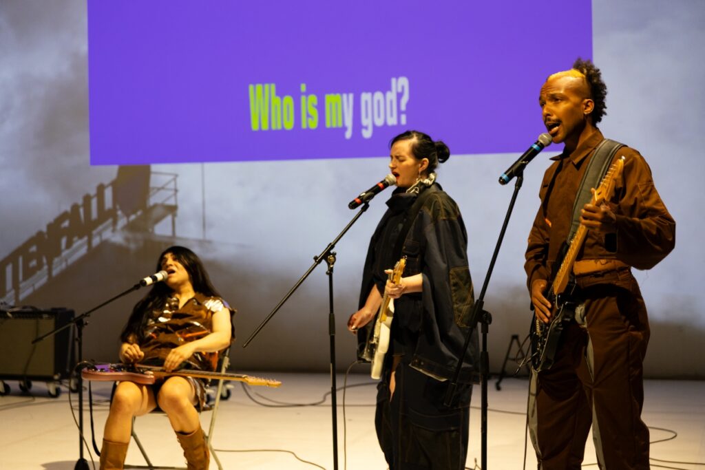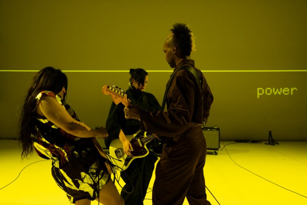 The questions that this piece throws out need no amplification. Yet there is amplification. Multiple amplifiers used in the performance take center stage, amplifying the music – the voice that is shouting disguised in the strumming of electric guitars. Presumably a smart way to make an already inflated matter bigger without having to provide direct solutions, which in any case is not necessarily the purpose of art.