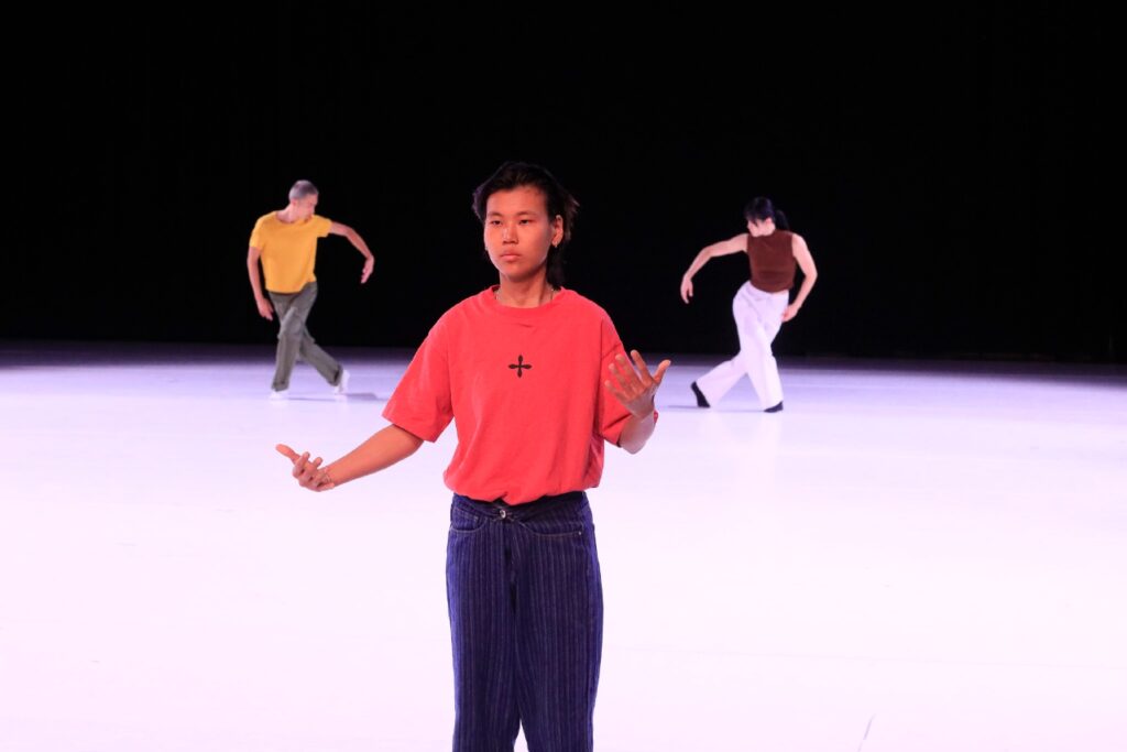 The interconnected pulses of colour and sound ripple across the space, actively binding all the performers (the narrators and the dancers). It reinforces everyone’s movements to fall in a state of synchronicity within the vast, bare studio, charged with stories and experiences told around the topics of detachment. This sensitive use of light and sound design as amplifiers draws the worlds of hearing and non-hearing together and communicates with the performers and audience members with different levels of auditory perception.