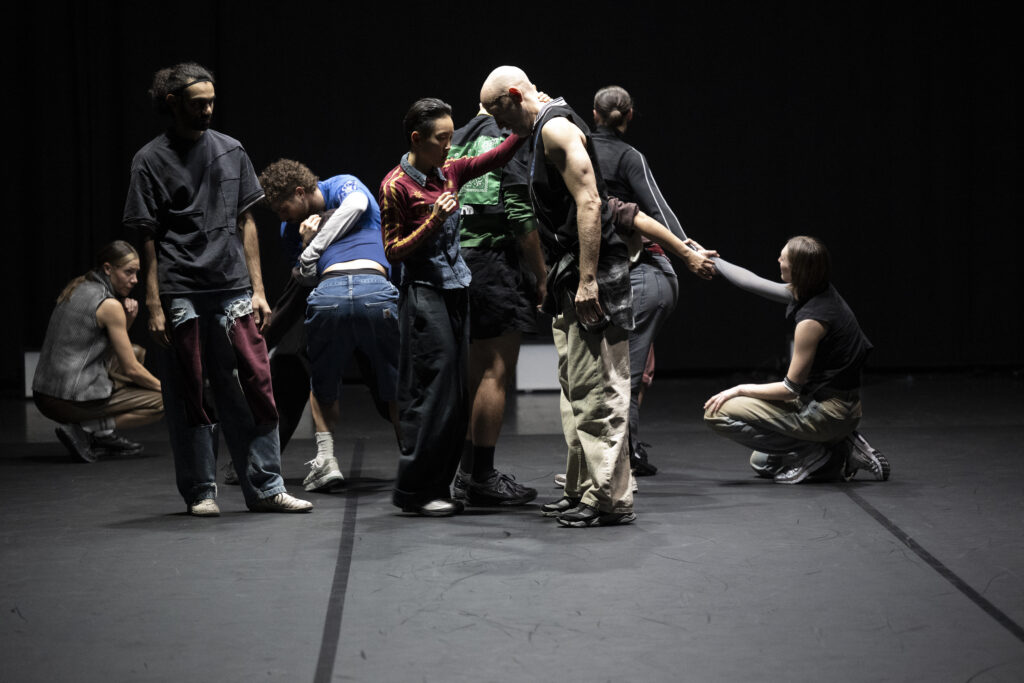 The multigenerational ensemble brings bodies with varied histories, ages, and experiences, legible in movement quality, effort management, and temporal relation. Energy is high, sometimes euphoric, yet never spectacularised: it arises from doing together, continuing despite everything. In this sense, SWEAT (anthem) functions truly as an anthem not by proclaiming a message, but by creating shared resistance. Endurance is not surpassing limits, but remaining within them: staying present together when the body asks for rest. The final kneeling/crouched position does not conclude, but settles in the space; darkness does not erase it, allowing the experience to linger in the spectator’s body.